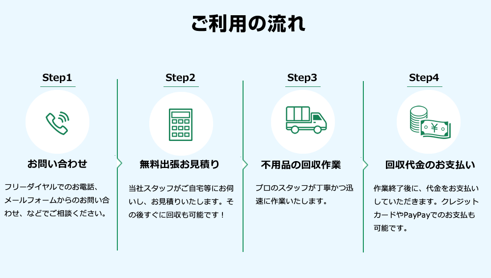 以前不用品を回収して頂いた際に、対応がすごく良かったので、今回、2回目の利用をさせていただきました。前回同様、迅速に作業していただき、さらに今回も安く引き取ってもらえて大満足です。また機会がありましたらよろしくお願いします。